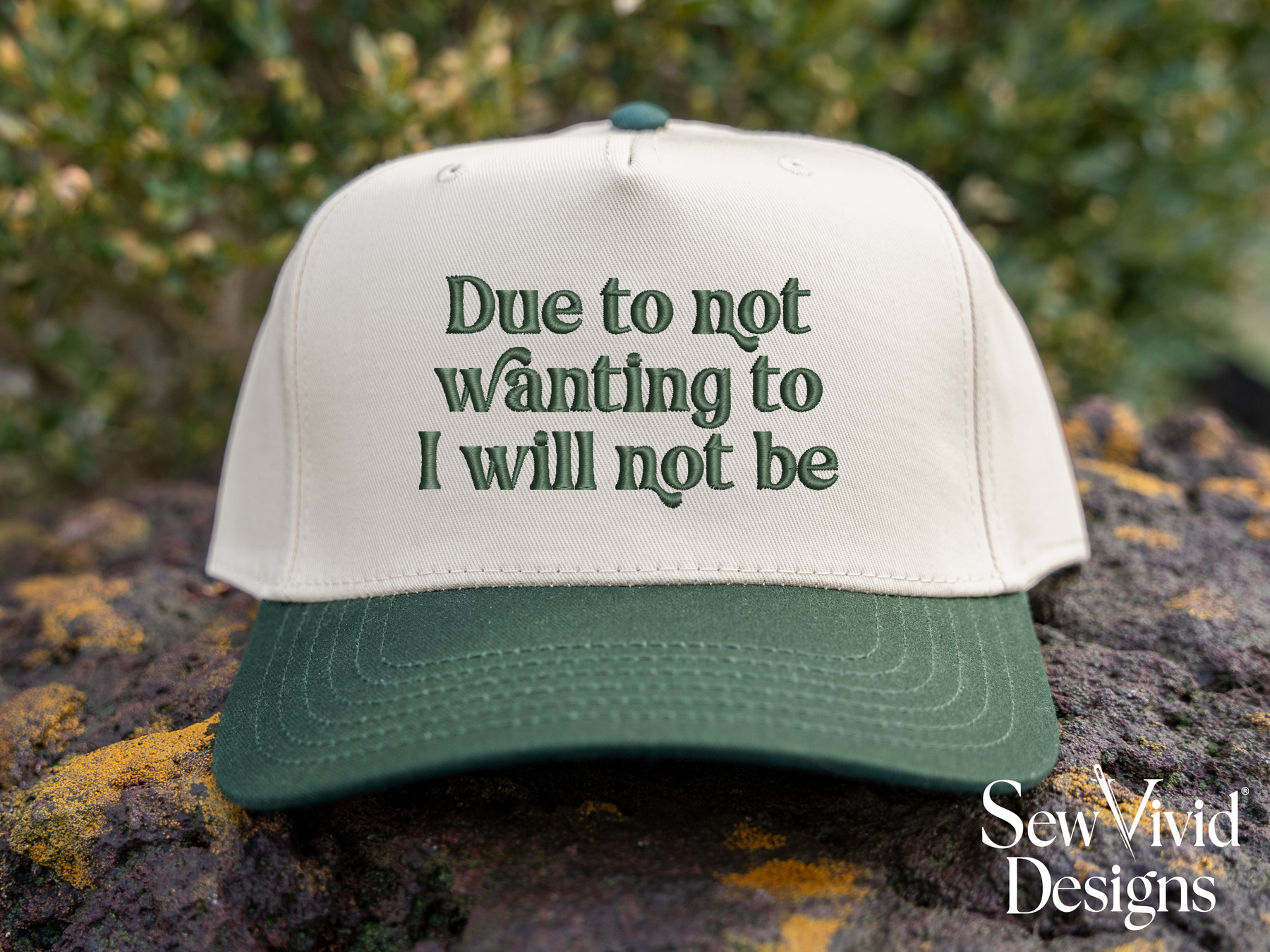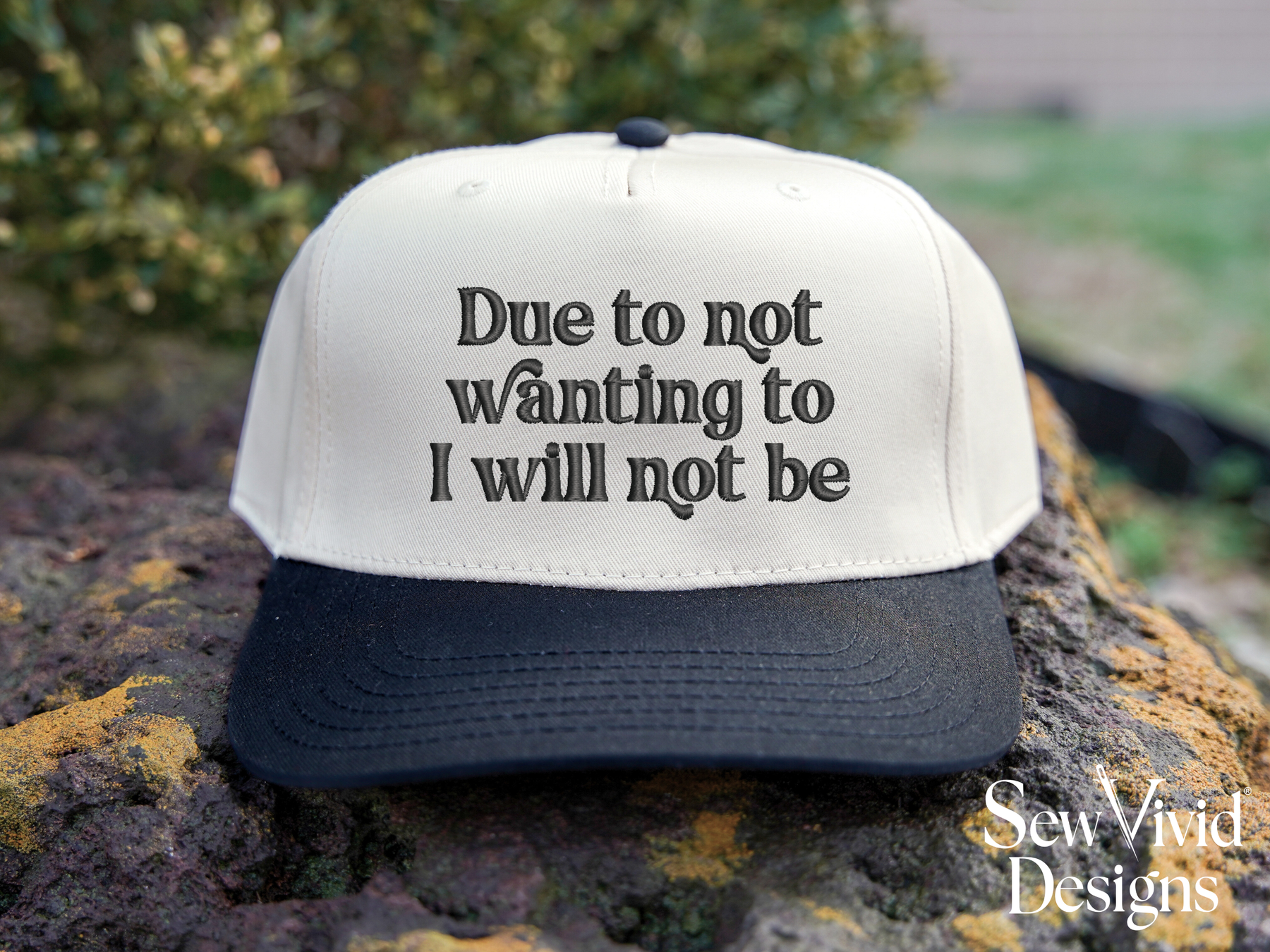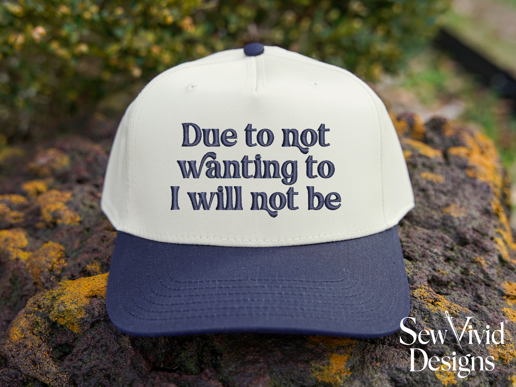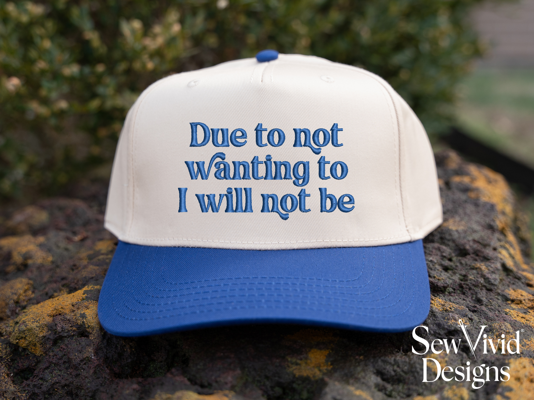 This cap features Due To Not Wanting To I Will Not Be embroidered on your choice of cap. Cap options shown in photos.