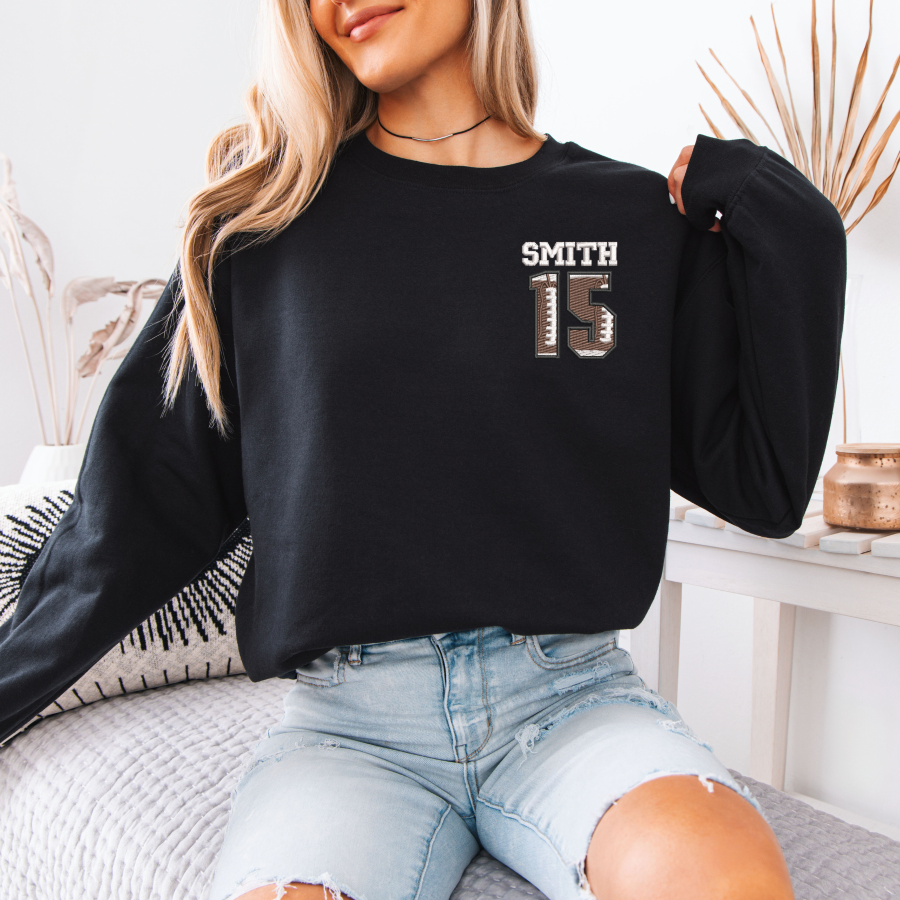 This cozy unisex sweater features your custom name and number embroidered on your selected sweater color and size.