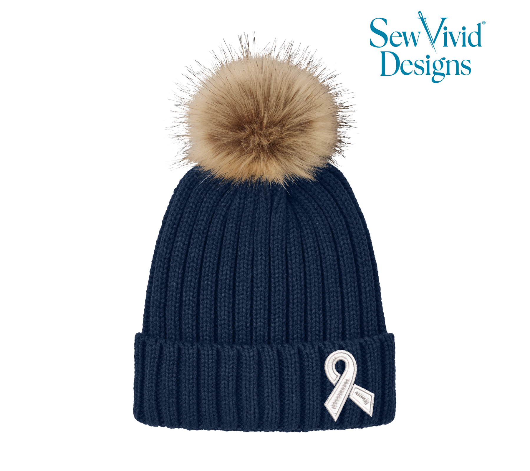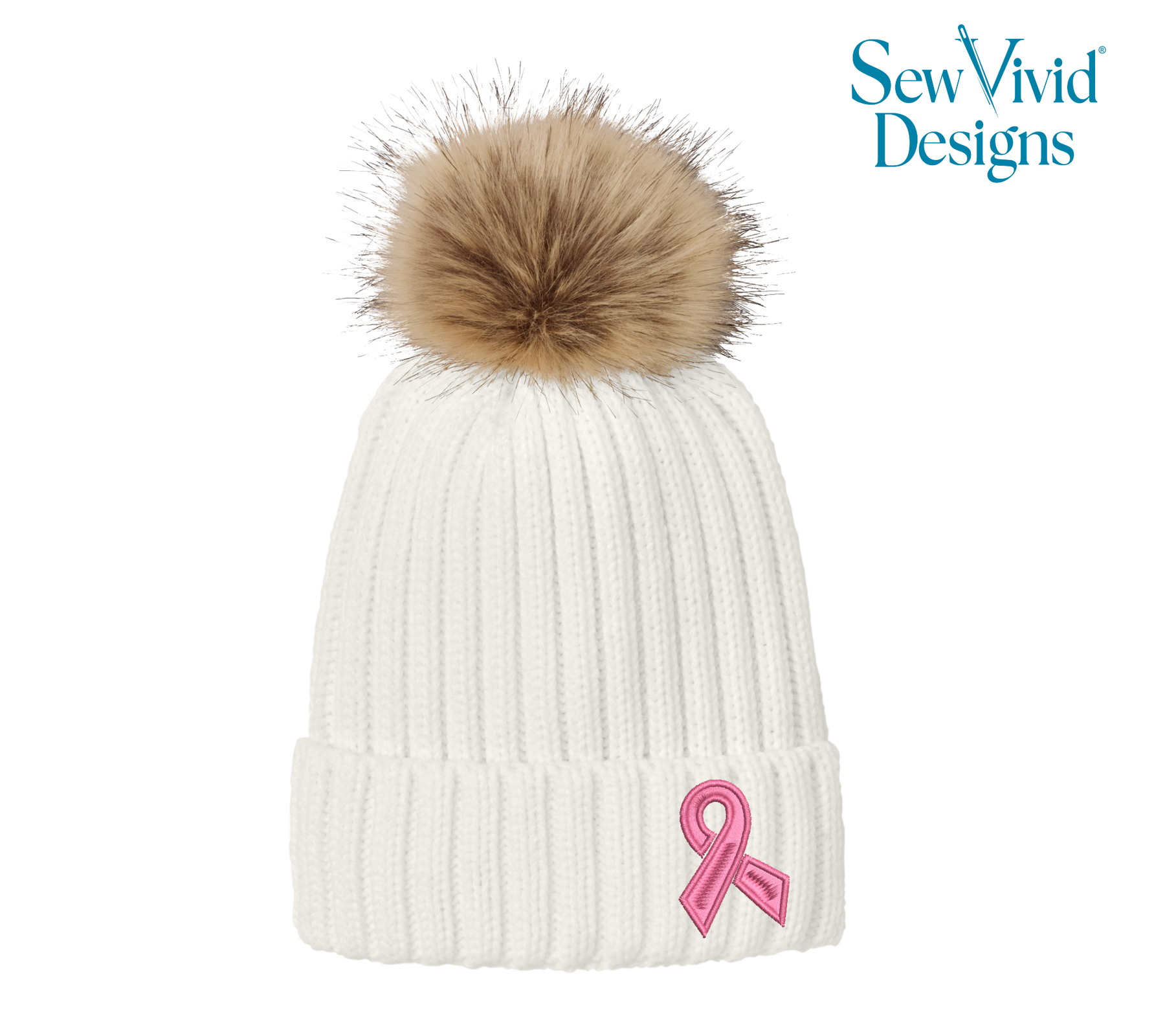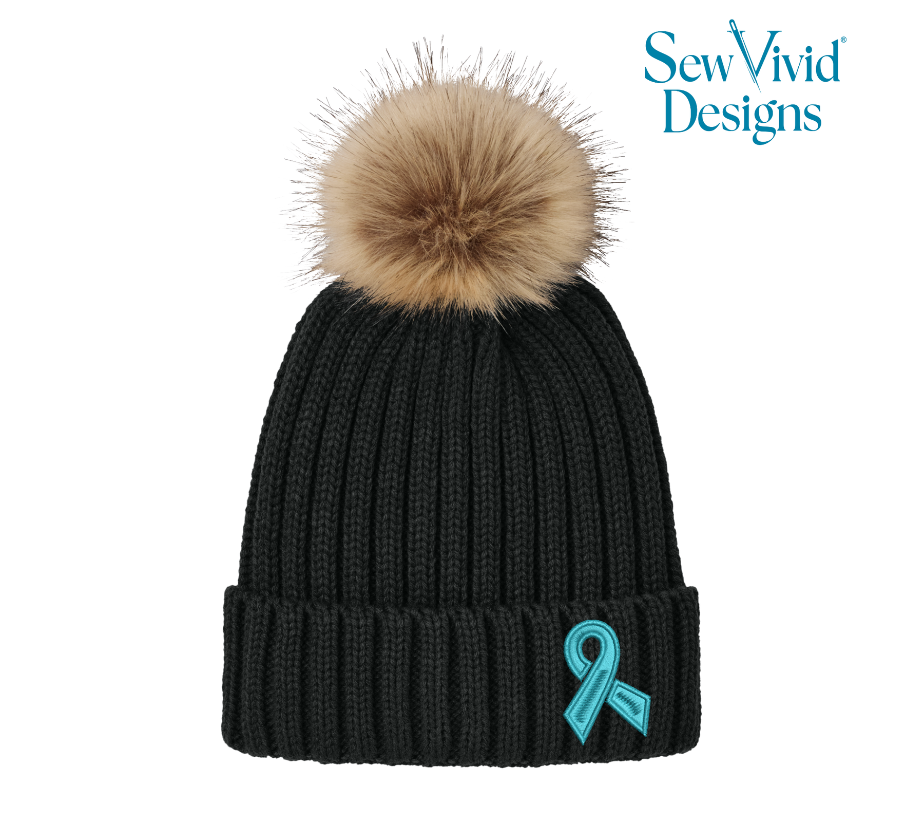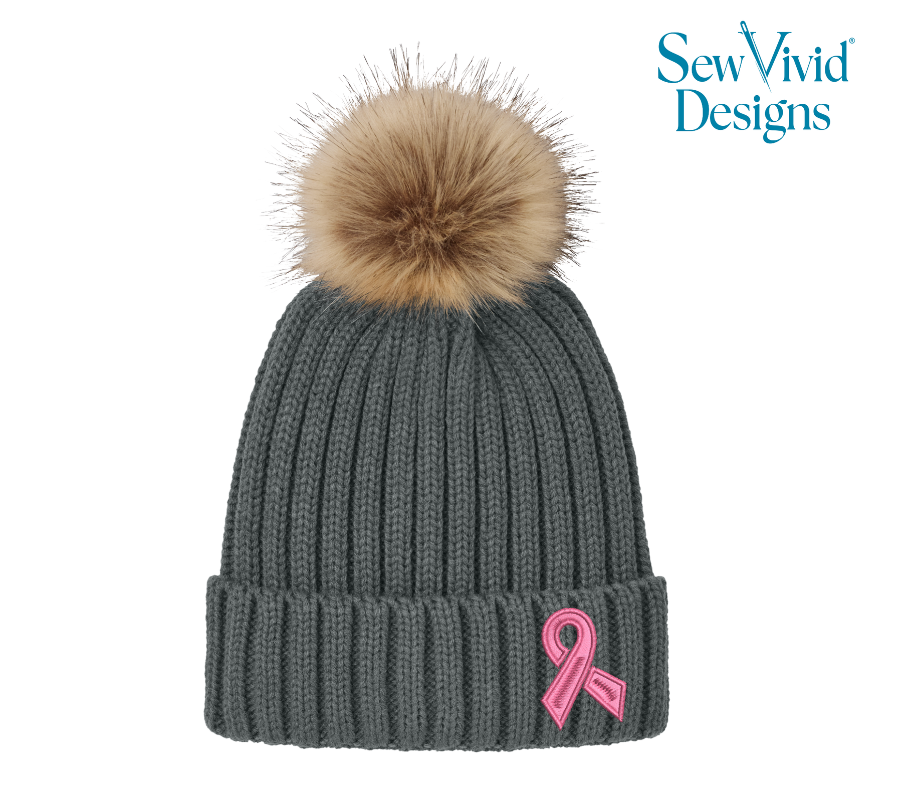 Cancer Ribbon | Embroidered Pom-Pom Beanie