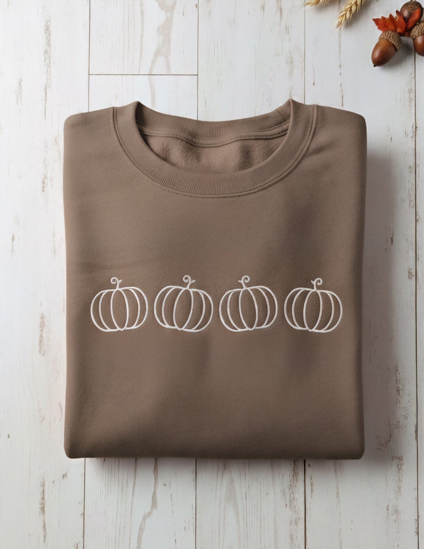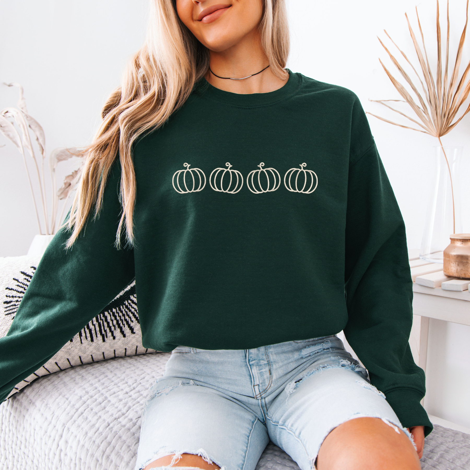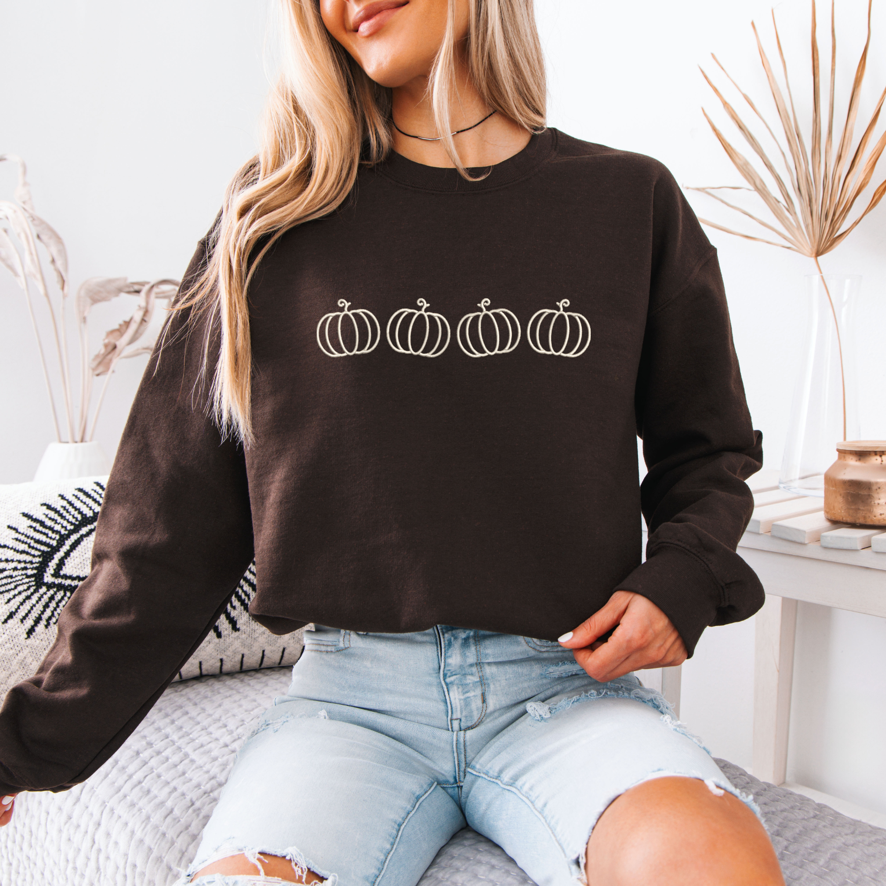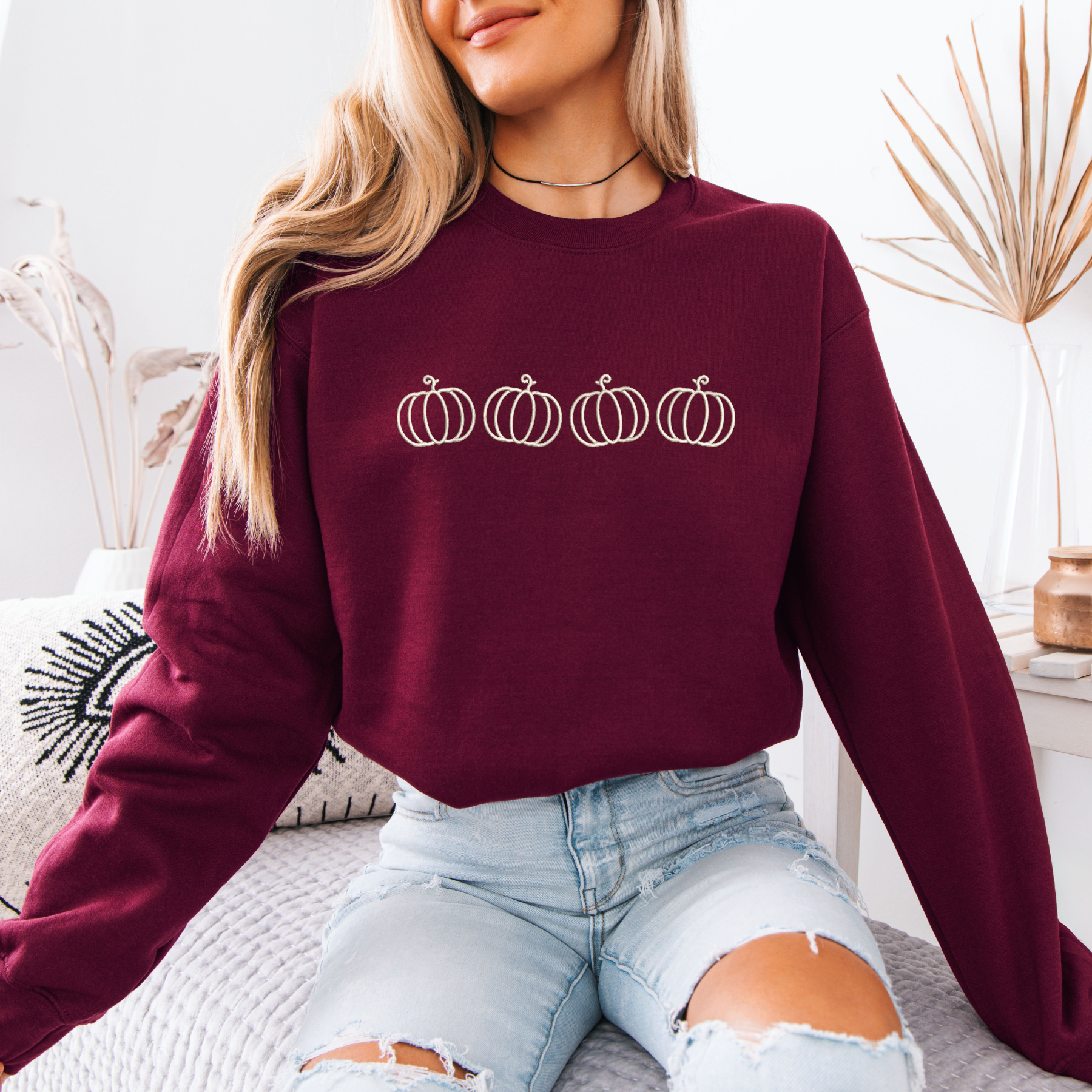 This cozy unisex sweater features pumpkins embroidered on your selected sweater color and size.