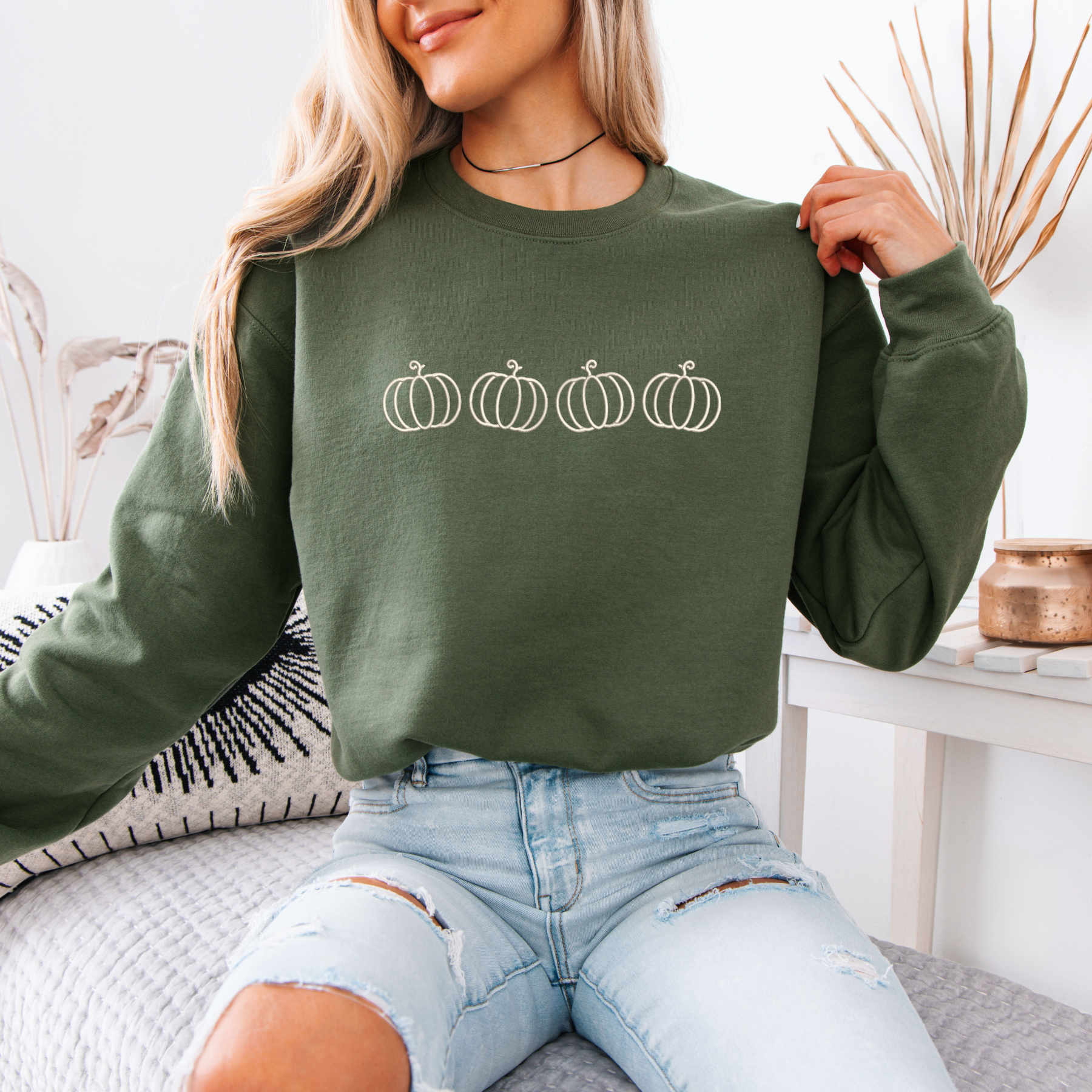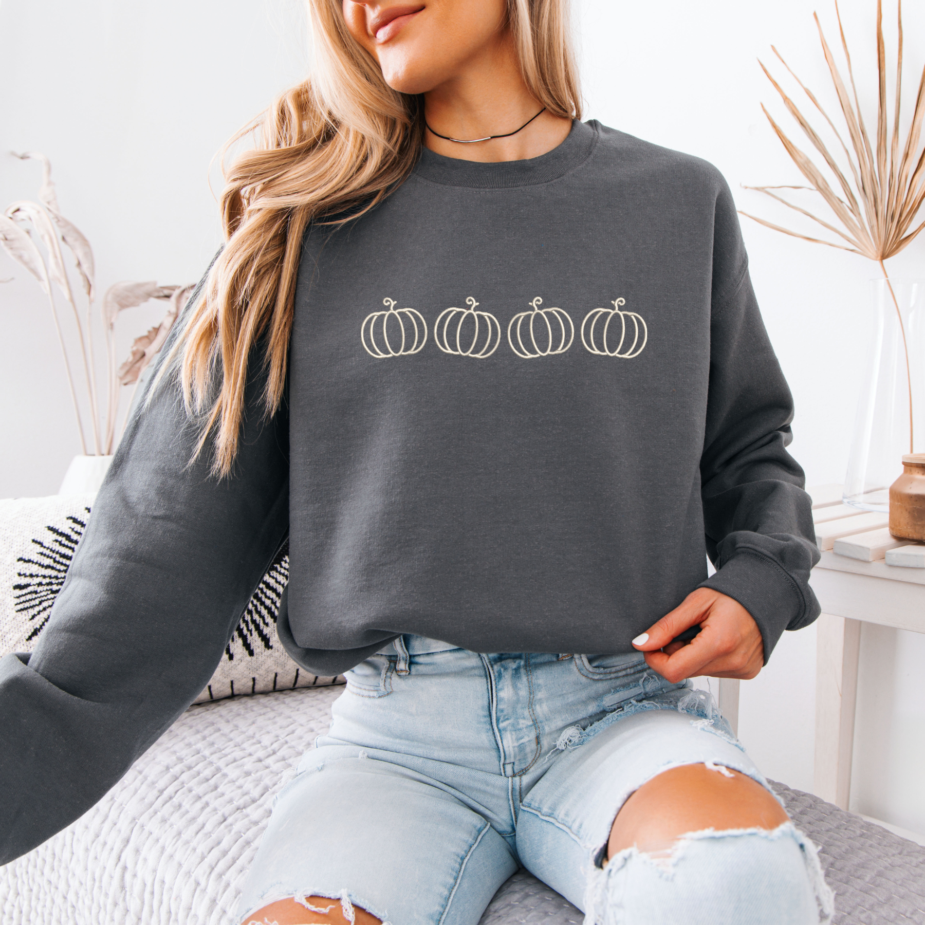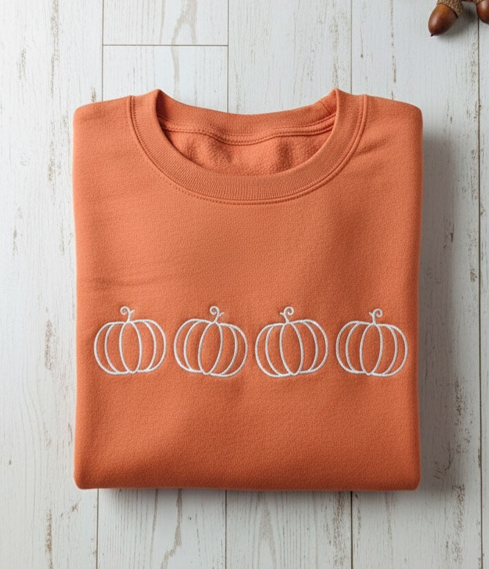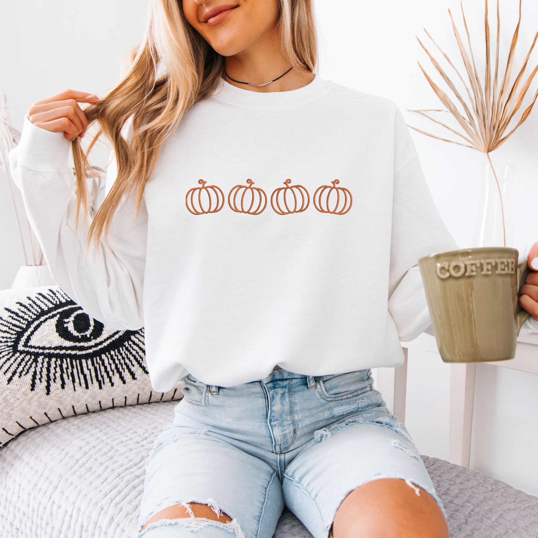 This cozy unisex sweater features pumpkins embroidered on your selected sweater color and size.