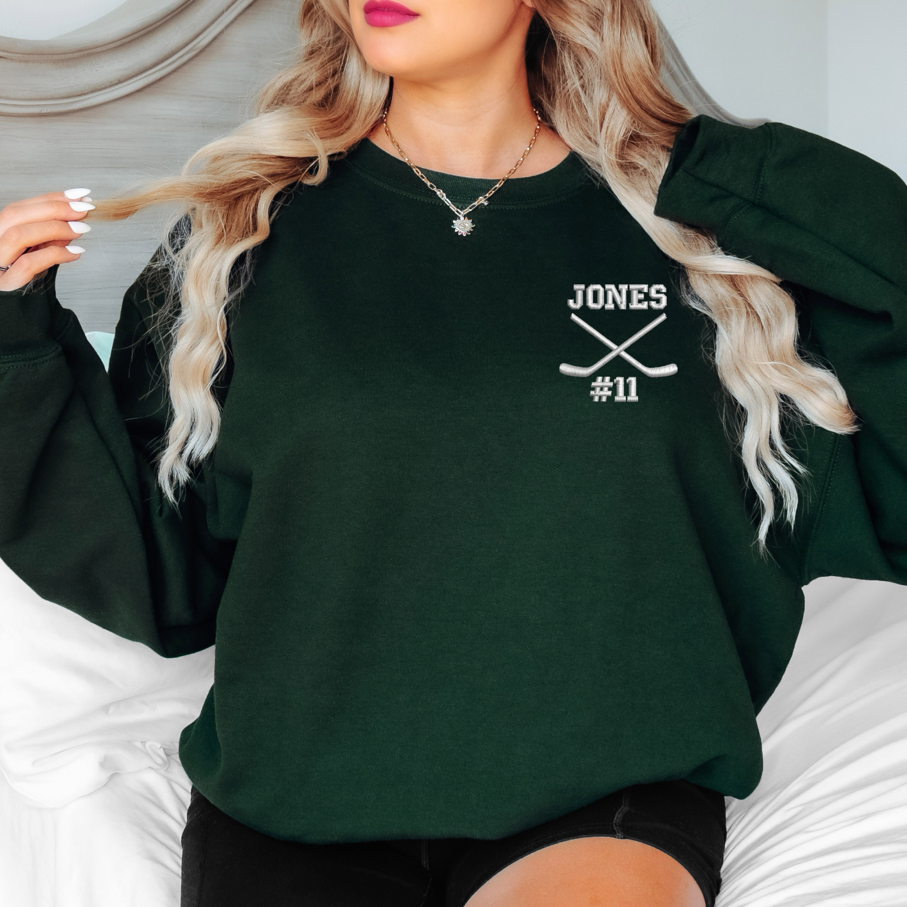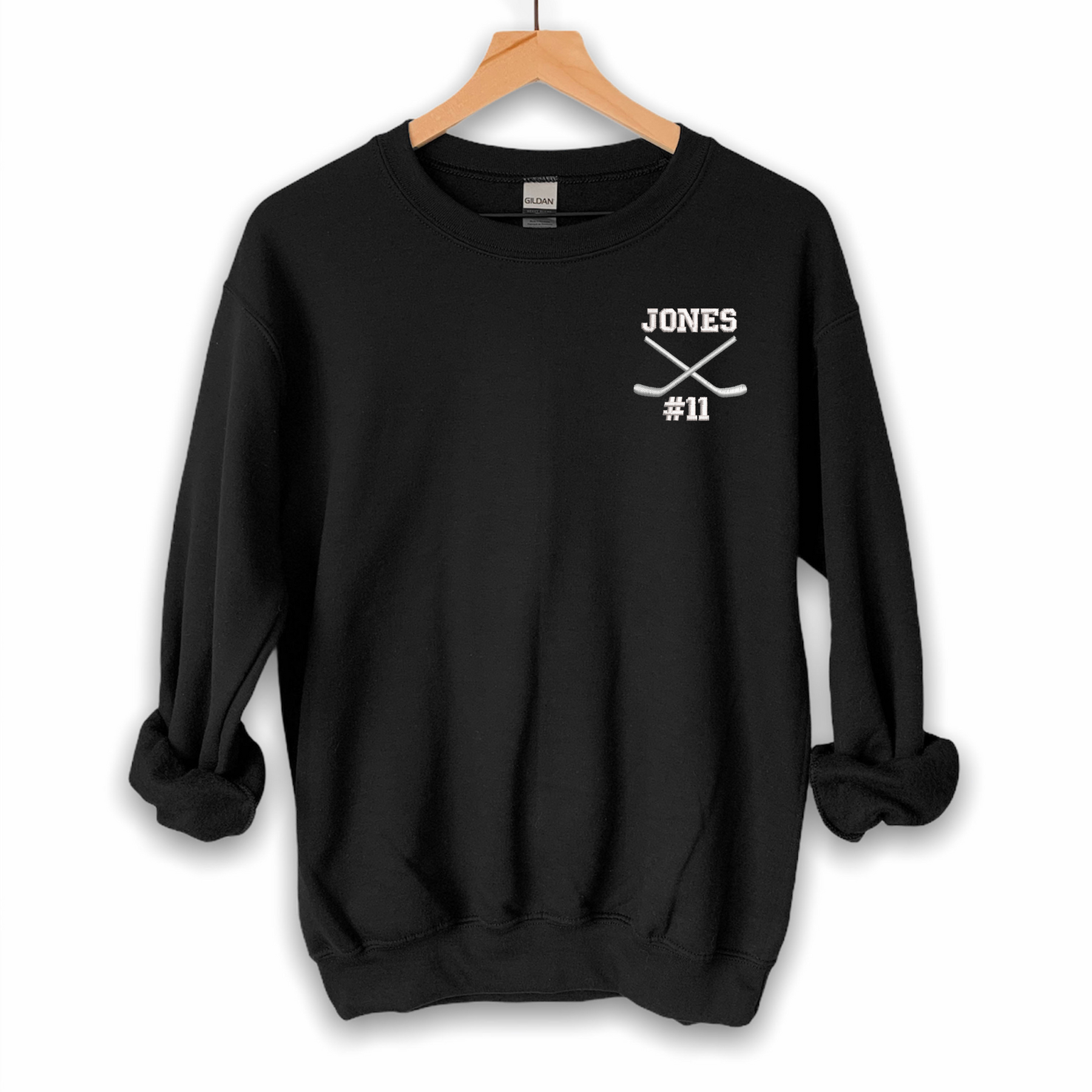 This cozy unisex sweater features 2 crossed hockey sticks with your custom name and number embroidered on your selected sweater color and size.