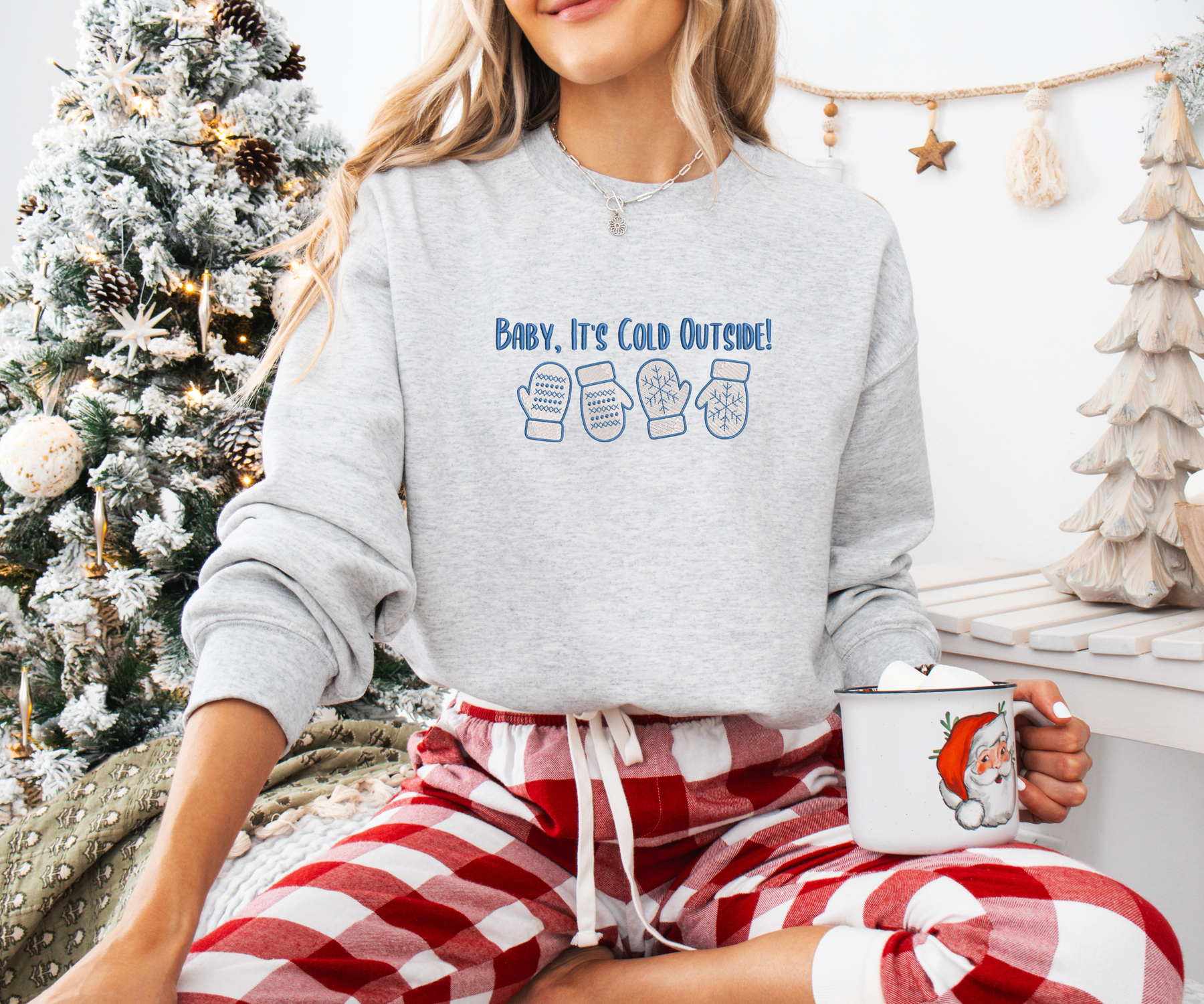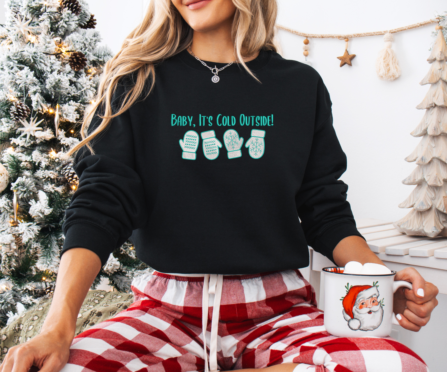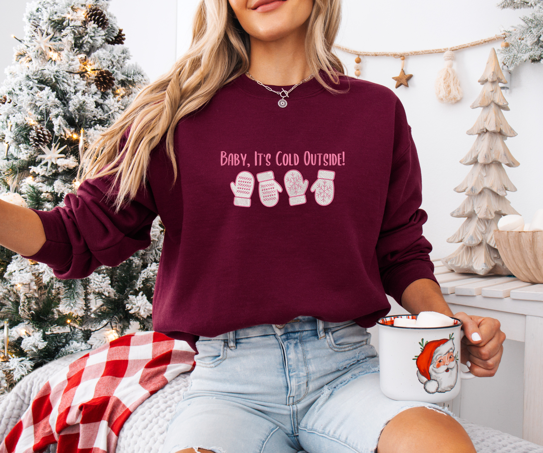 This cozy unisex sweater features Baby, It's Cold Outside! embroidered on your selected sweater color and size.