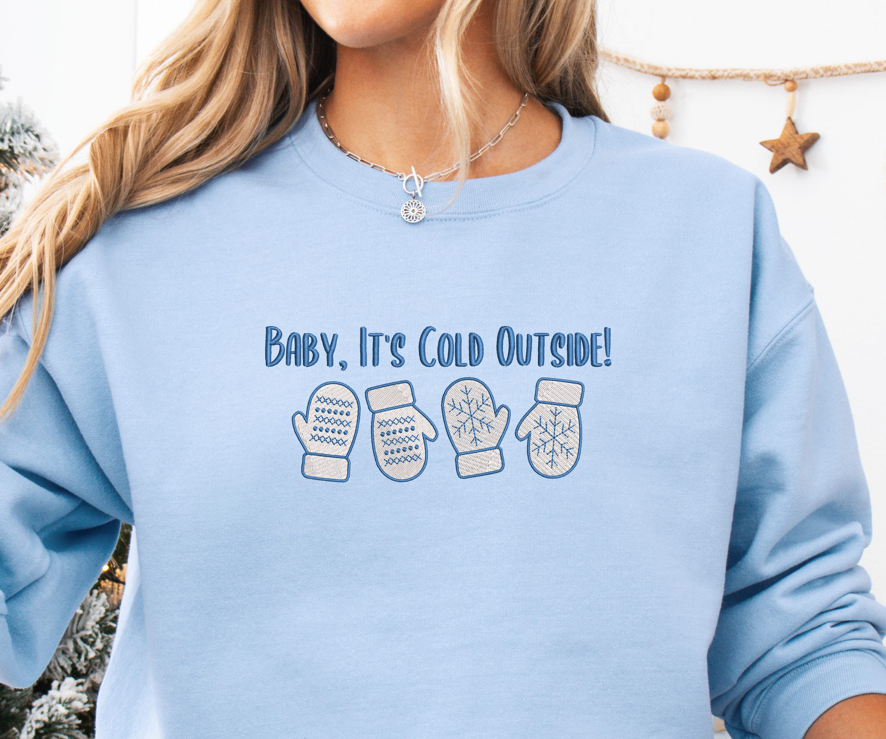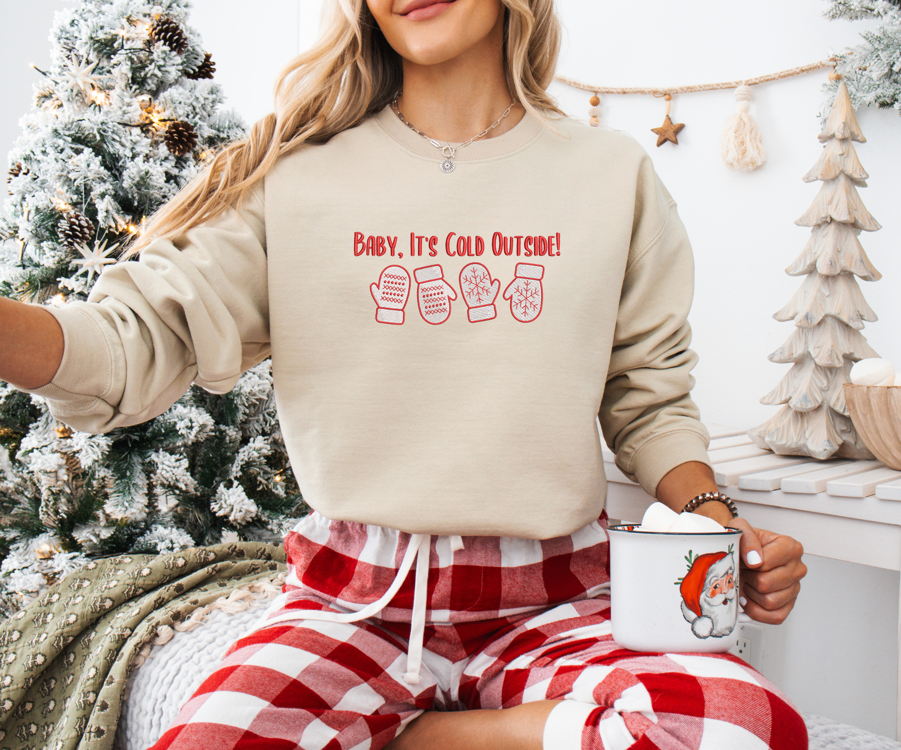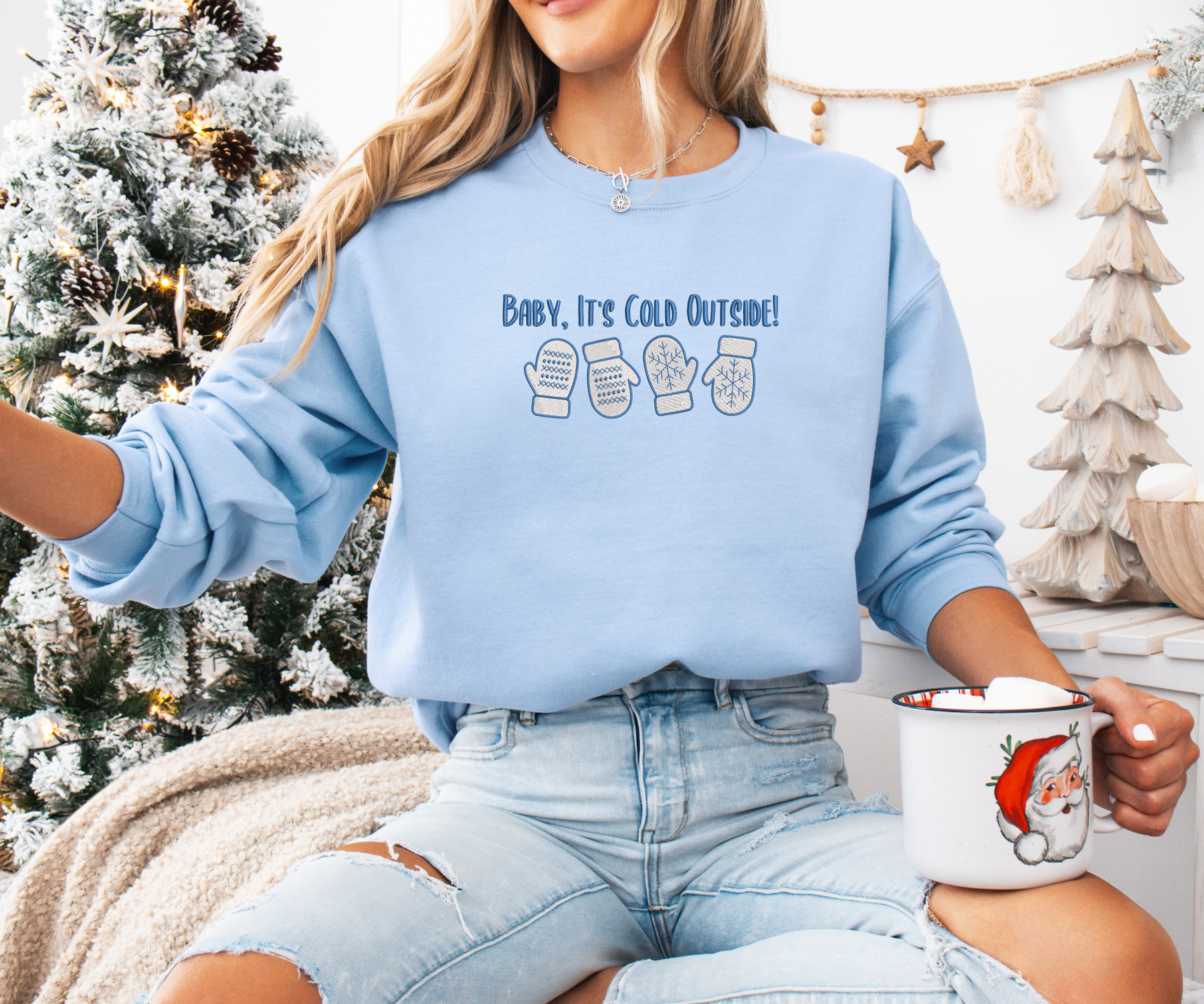 This cozy unisex sweater features Baby, It's Cold Outside! embroidered on your selected sweater color and size.
