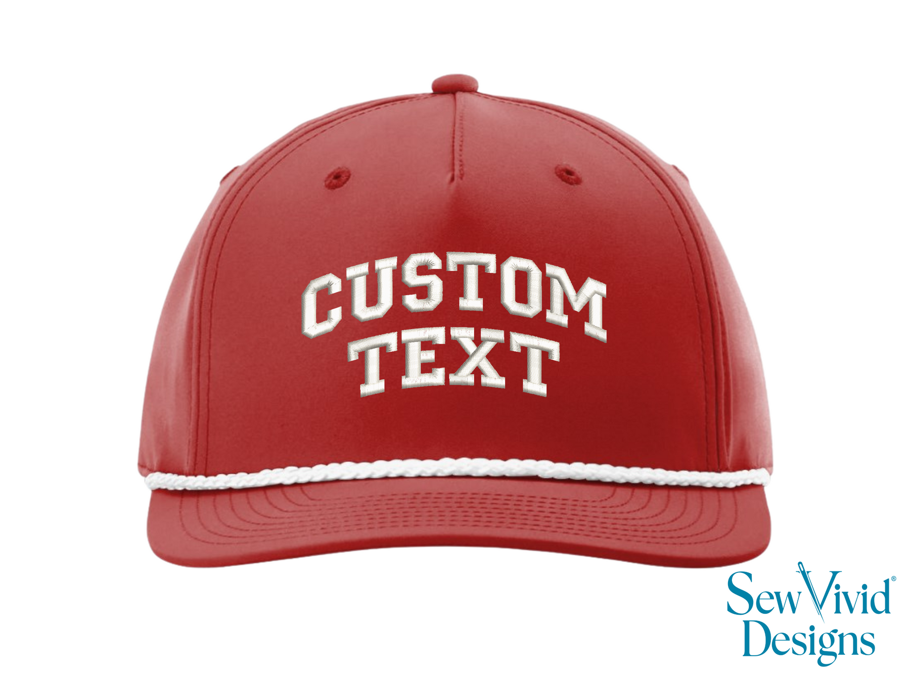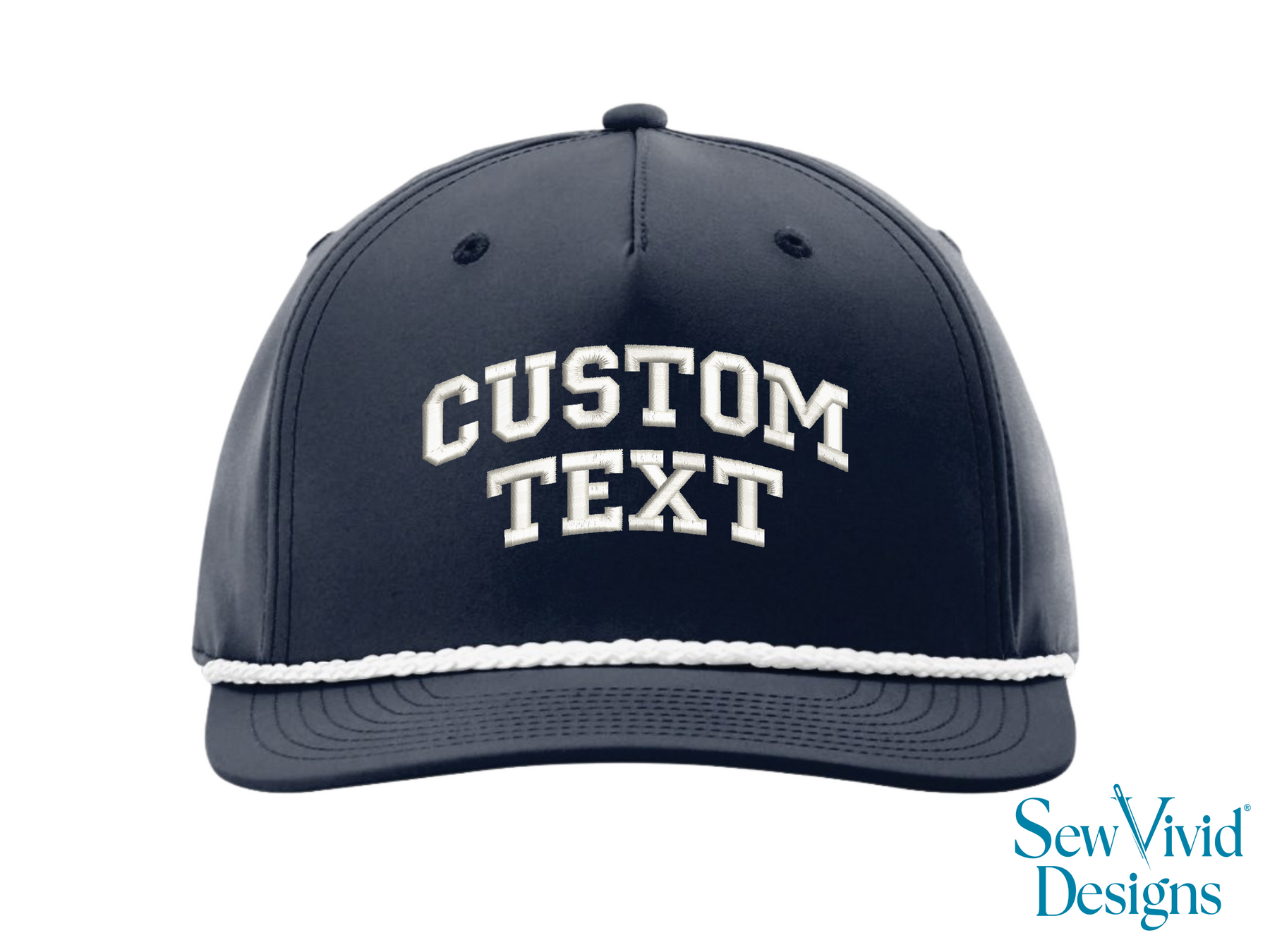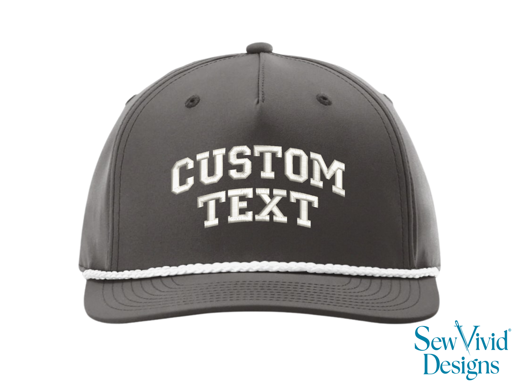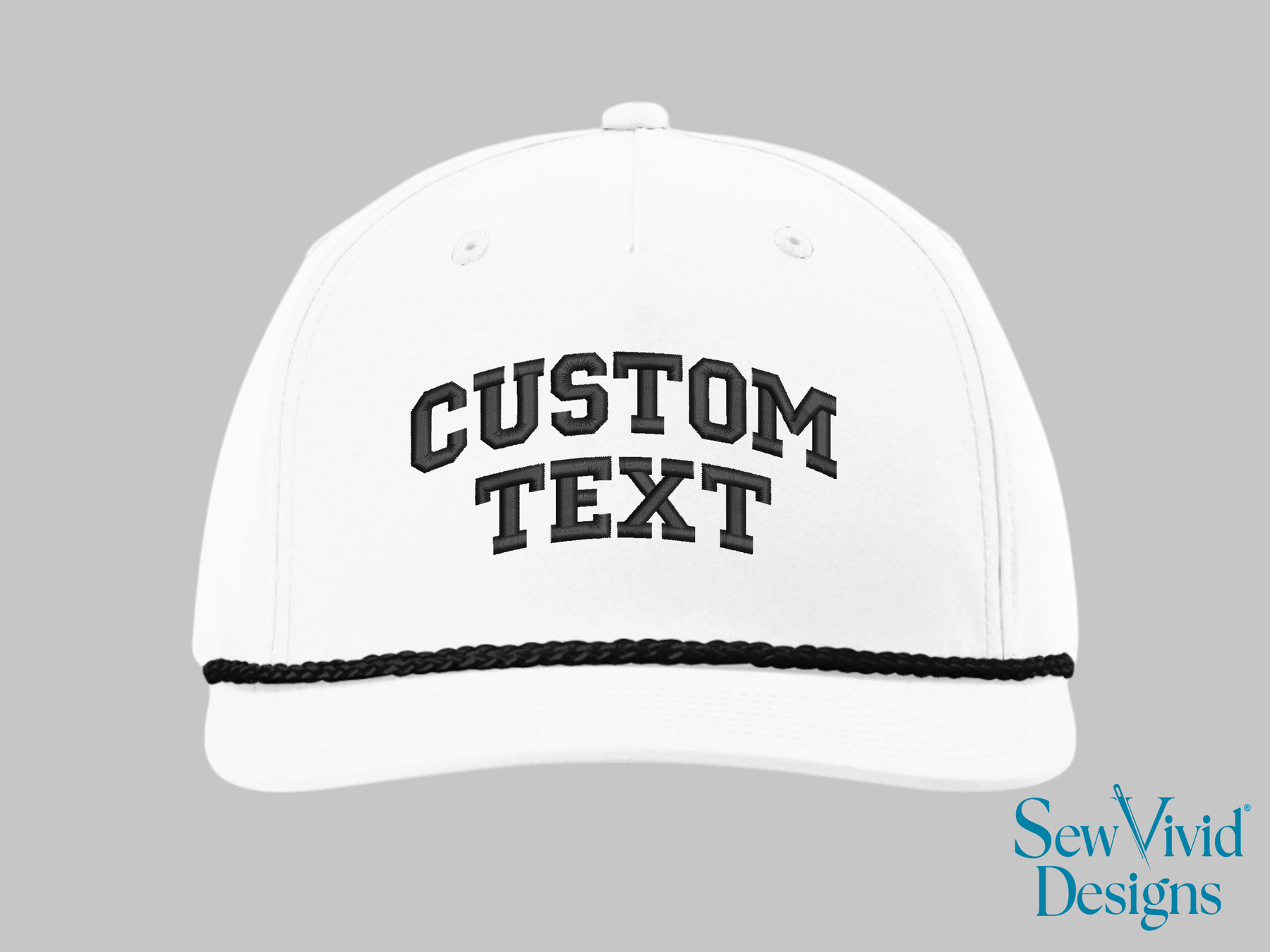 This trendy cap features your custom text embroidered in an arc on your choice of cap. Trucker cap color options shown in photos above.