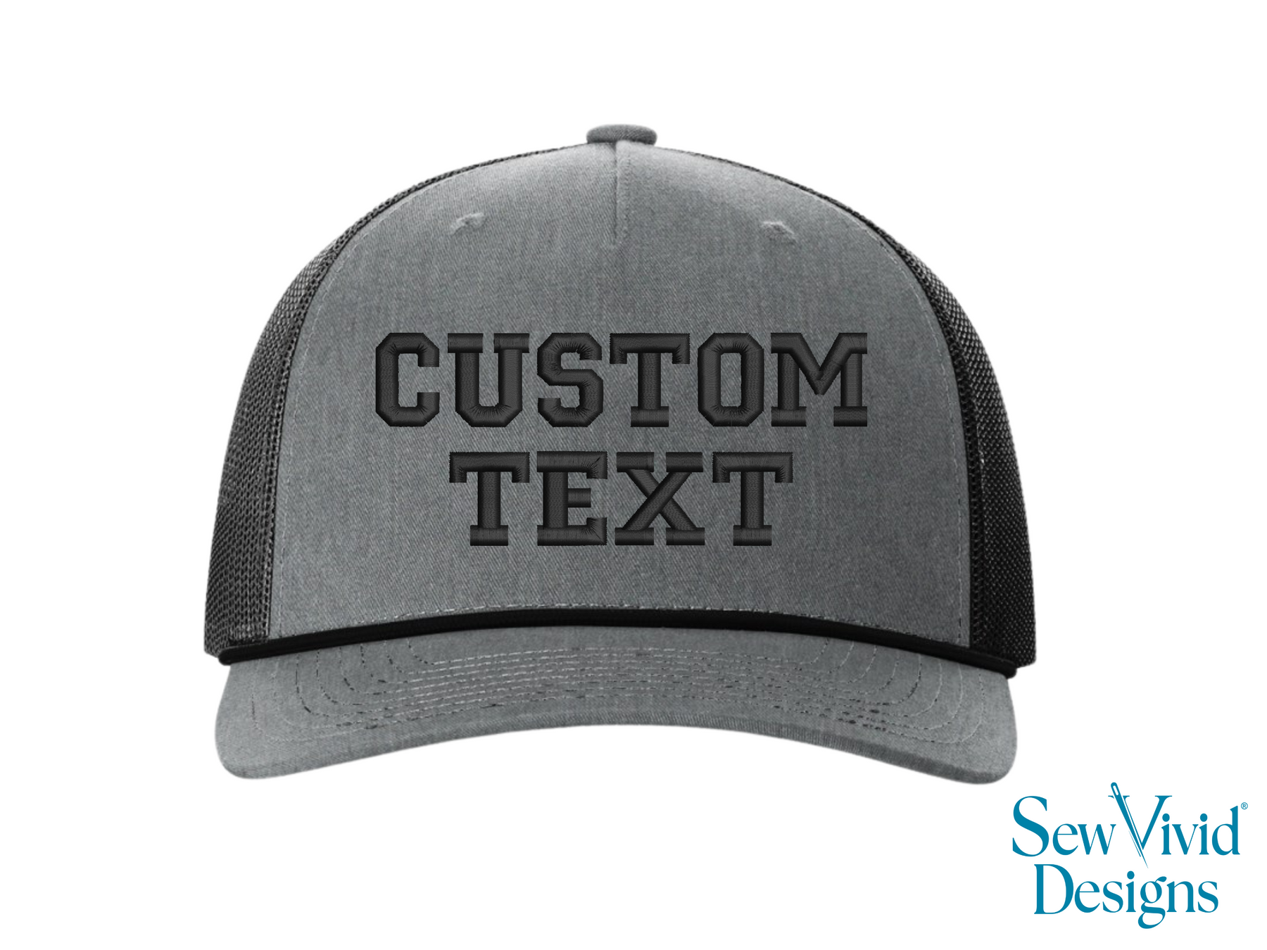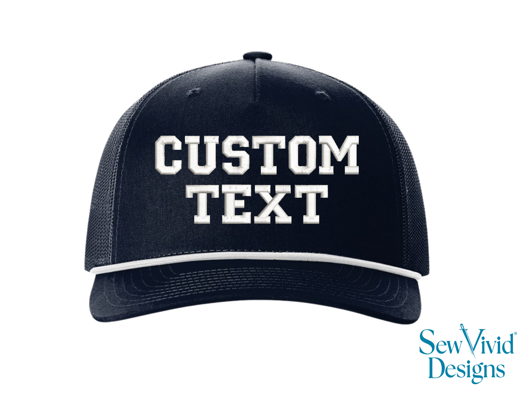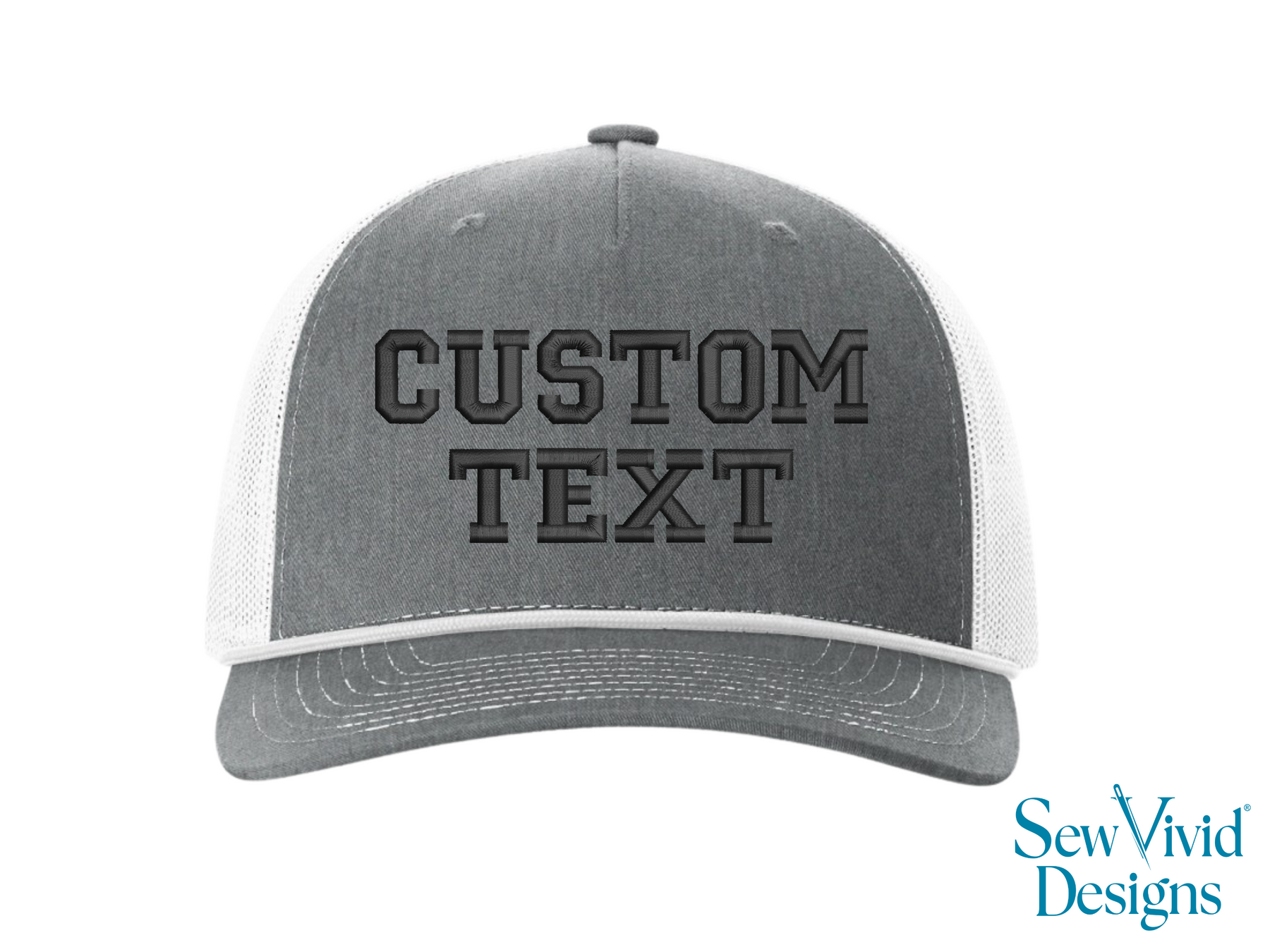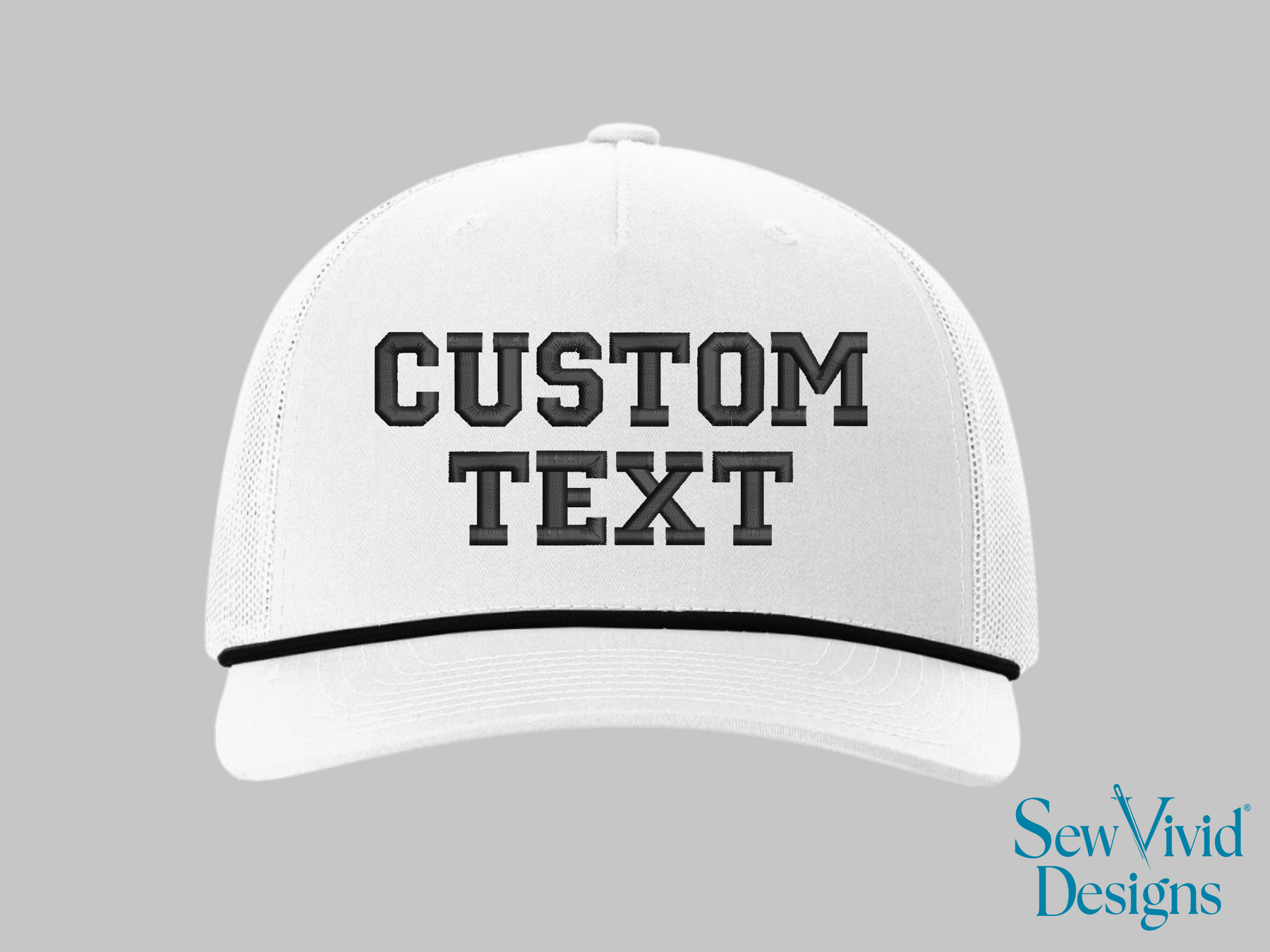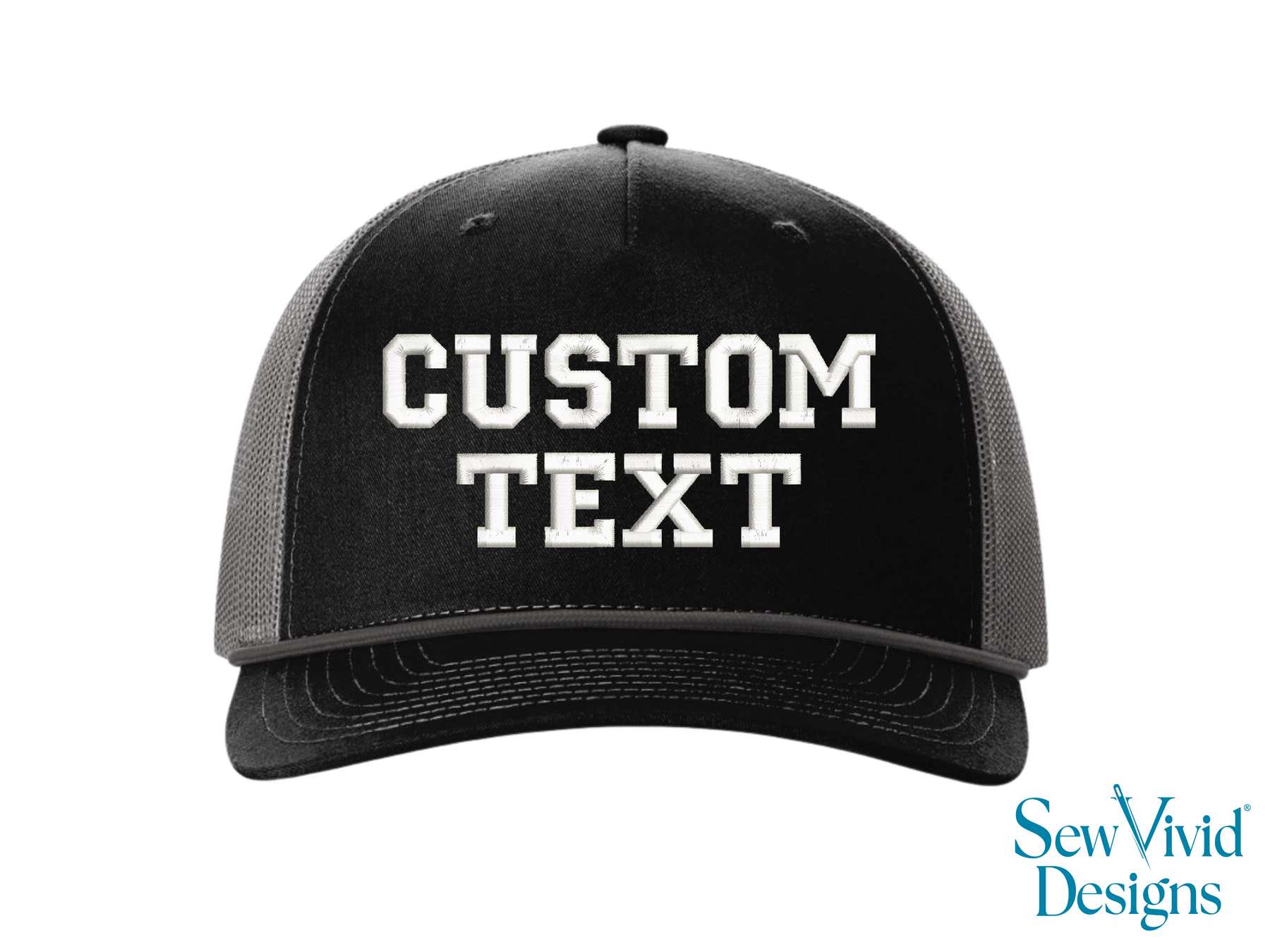 This trendy cap features your custom text embroidered on your choice of cap. Trucker cap color options shown in photos above.