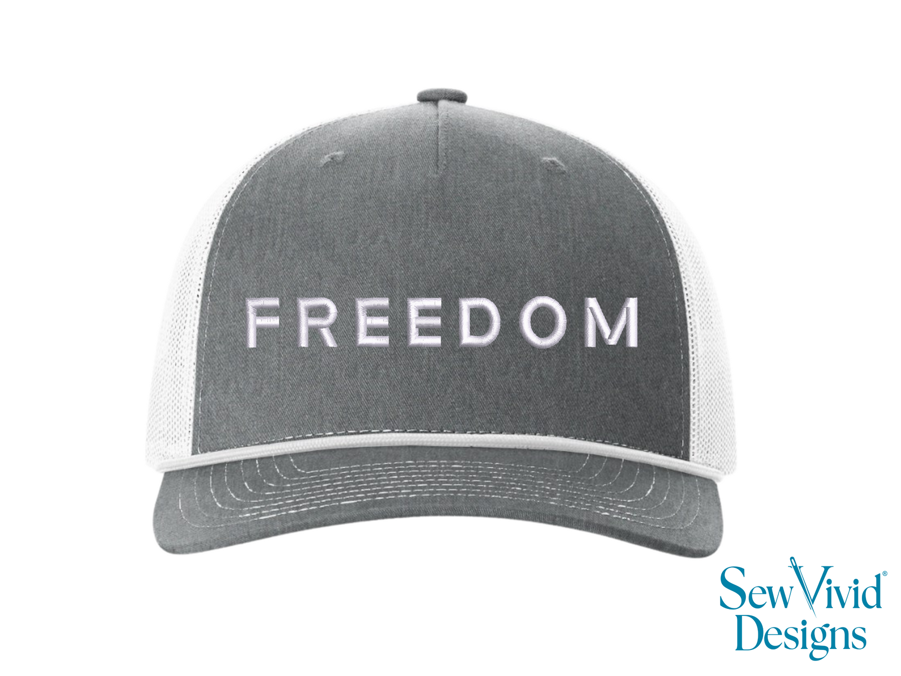 This trendy cap features FREEDOM embroidered choice of cap. Trucker cap color options shown in photos above.