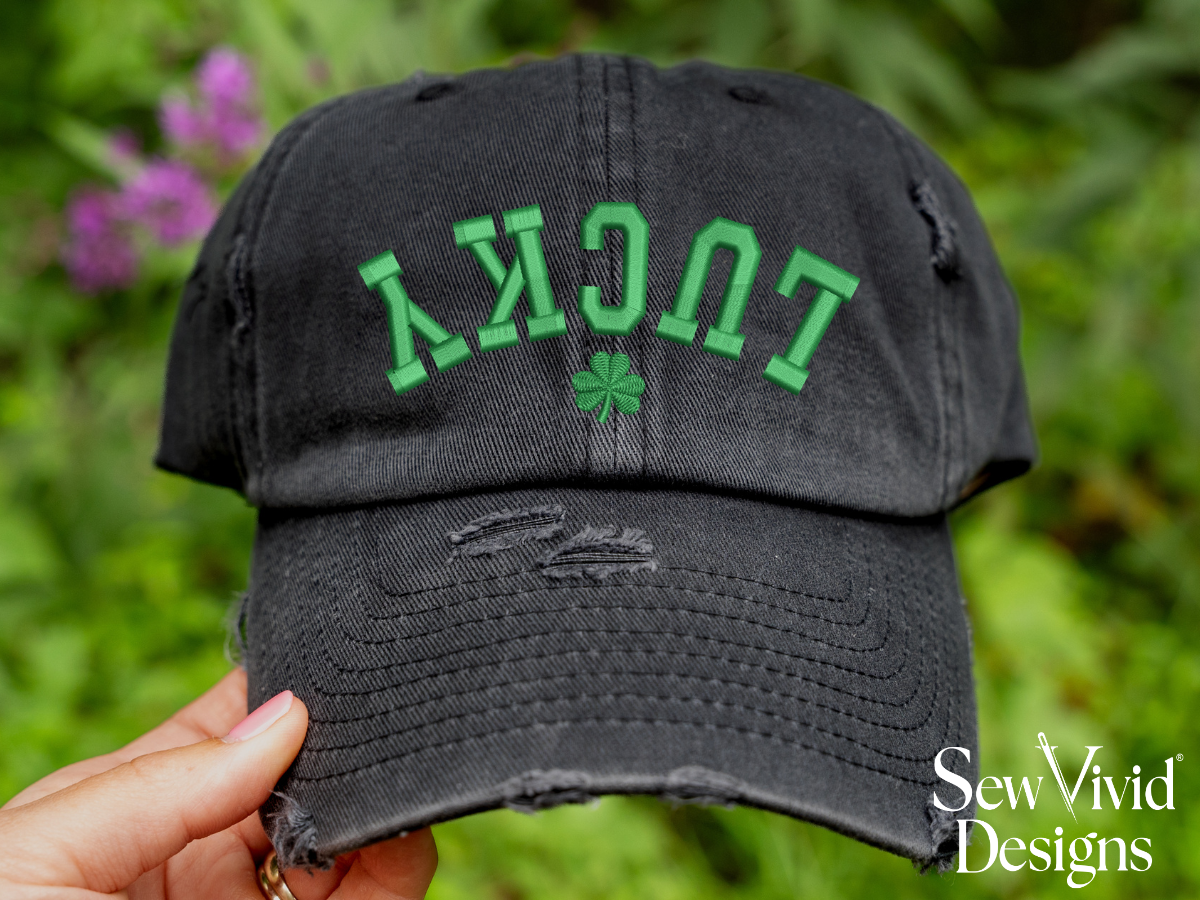 This cap features LUCKY with a shamrock embroidered upside down in a curve on your choice of cap. Cap options shown in photos.